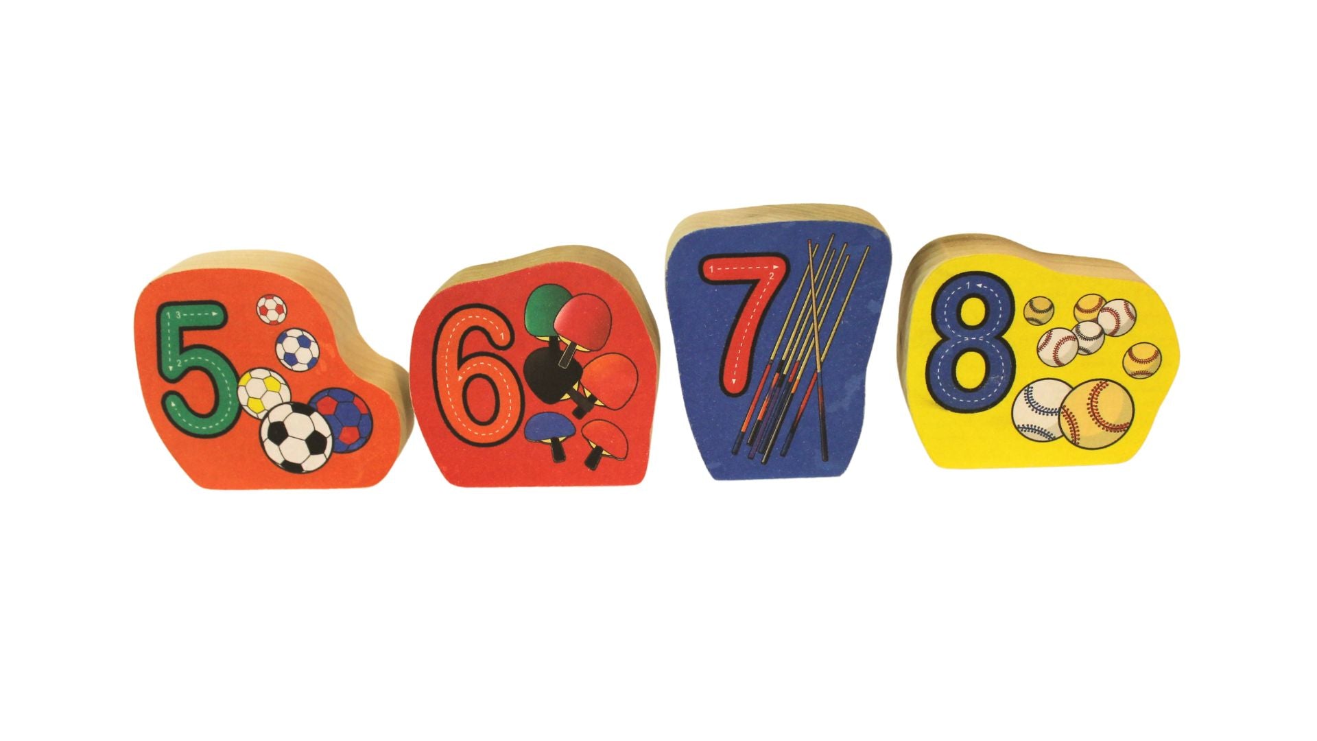 Our vibrant and engaging educational toy blocks are designed to captivate the minds of little learners, combining fun with educational value. On one side, they feature a colorful picture paired with a corresponding number, allowing children to develop visual recognition skills. On the other side, the number is beautifully spelled out in letters, encouraging early reading and literacy development. Crafted with durable materials and adorned with delightful illustrations, this block set is sure to provide hours of educational enjoyment and endless discoveries for your little one. The blocks are numbered one through twelve. The front illustrates the number with objects - one ball, two baseball bats, etc.