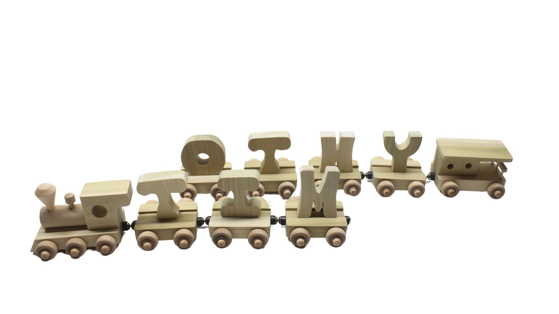 Personalized Wood Toy Train with Engine and Seven Cars, and Caboose to Spell a Child's Name